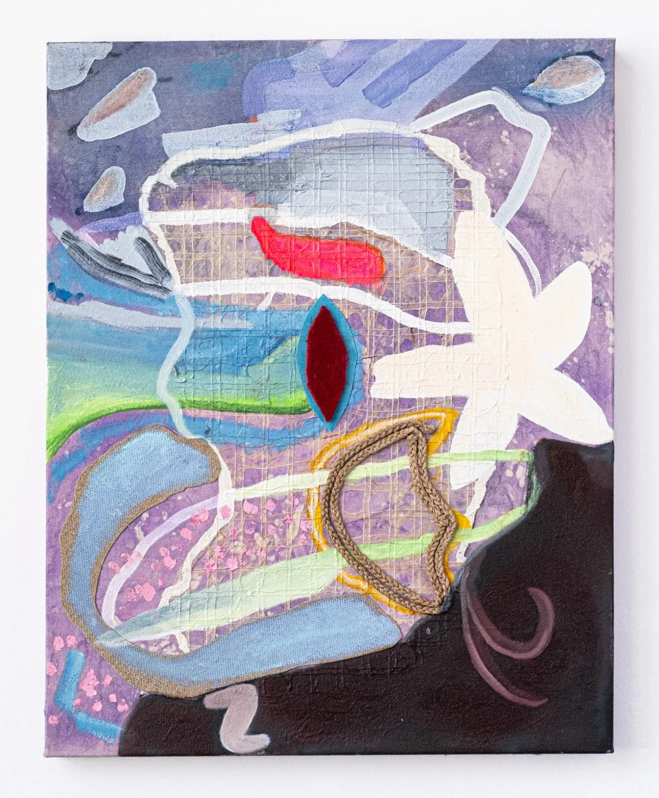 Because, My Heart, 2024. 20x16 in. Oil, acrylic, open weave, velvet, string, linen collage on dyed canvas.